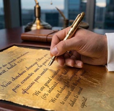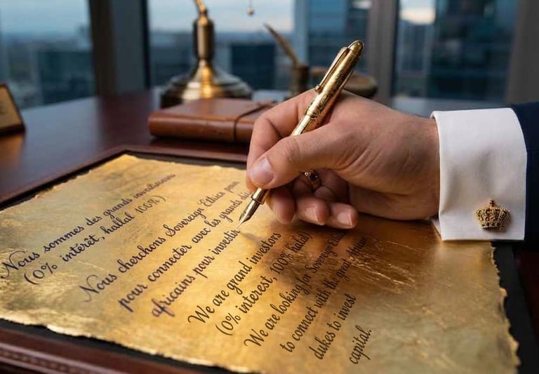 Sovereign Ethics Inc. agit comme un filtre exclusif entre le capital mondial et les nations. Notre mission est d'assurer la pureté éthique de chaque transaction. Avant toute mise en relation, nous vérifions rigoureusement l'alignement des investisseurs avec notre charte Zero Riba.